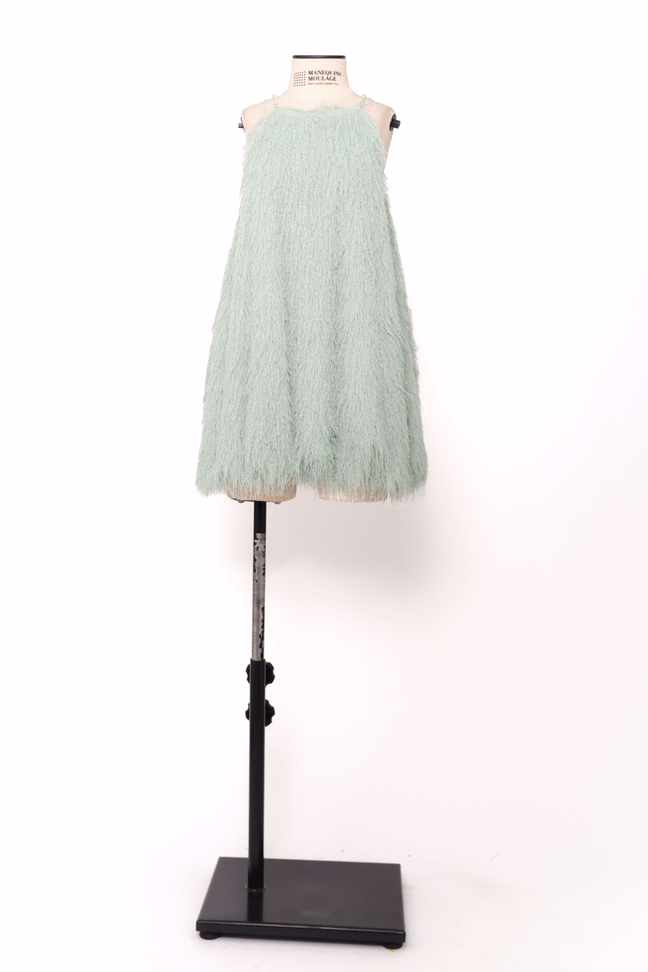 VESTIDO BALONE PLUMAS VERDE AGUA ALÇA FINA STRAS