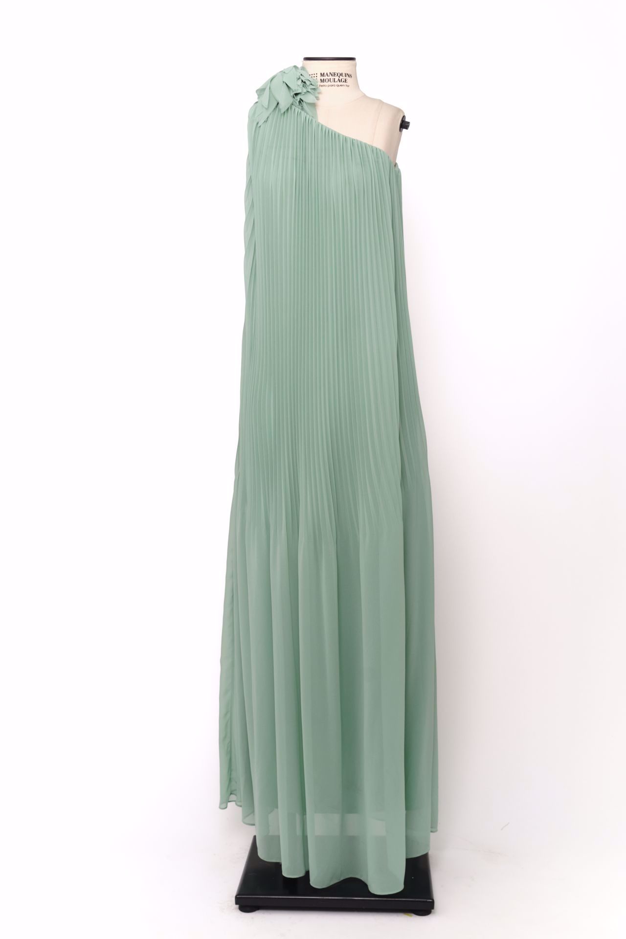 VESTIDO LONGO PLISSADO VERDE MENTA 1 OMBRO UNICO FLOR