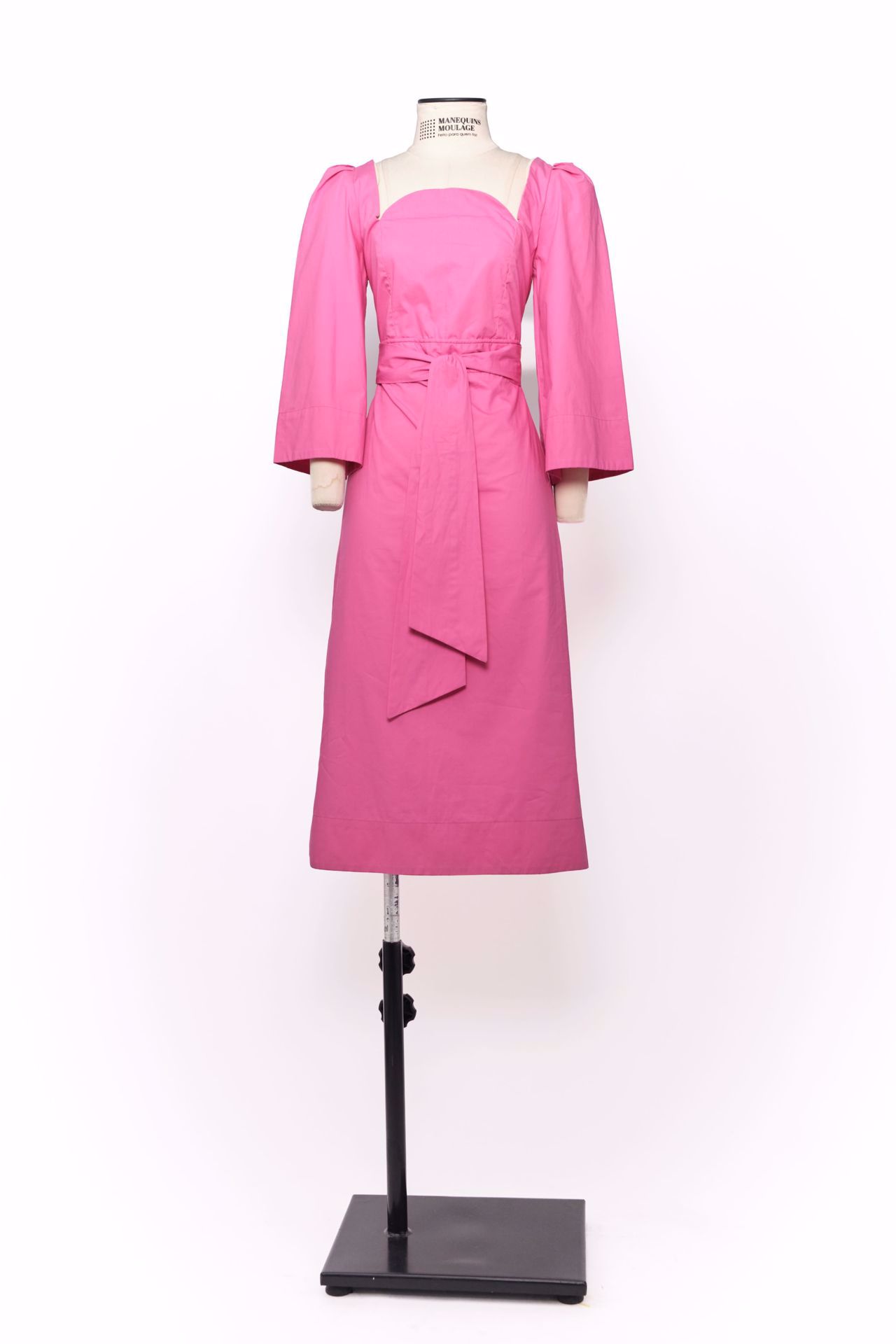 -TAMANHO: 36 -MARCA:LO DE LUI -VESTIDO MIDI ROSA CHICLETE DECOTE REDONDO MANGA BUFANTE FAIXA CINTURA
